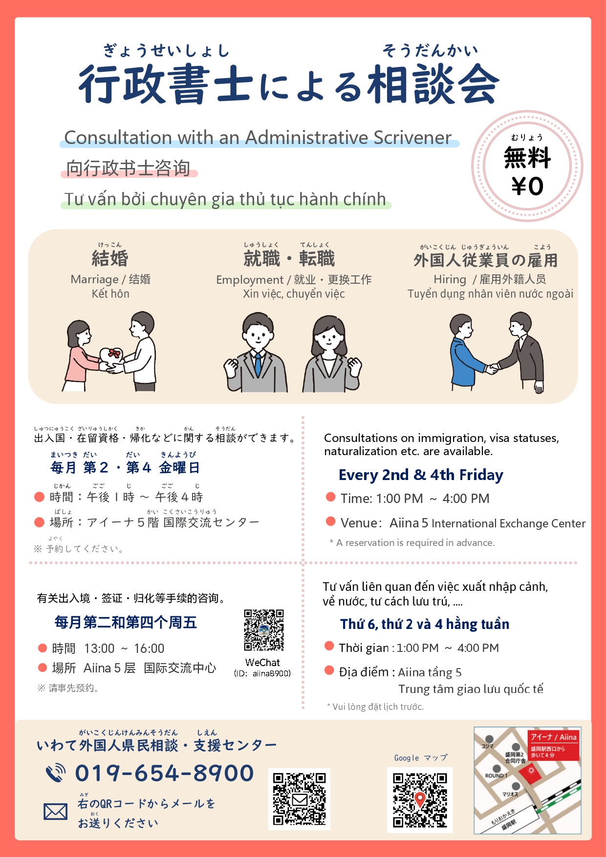 | 〇 | Legal advice is available on residence status, marriage, divorce, inheritance, money problems, accidents, etc. |